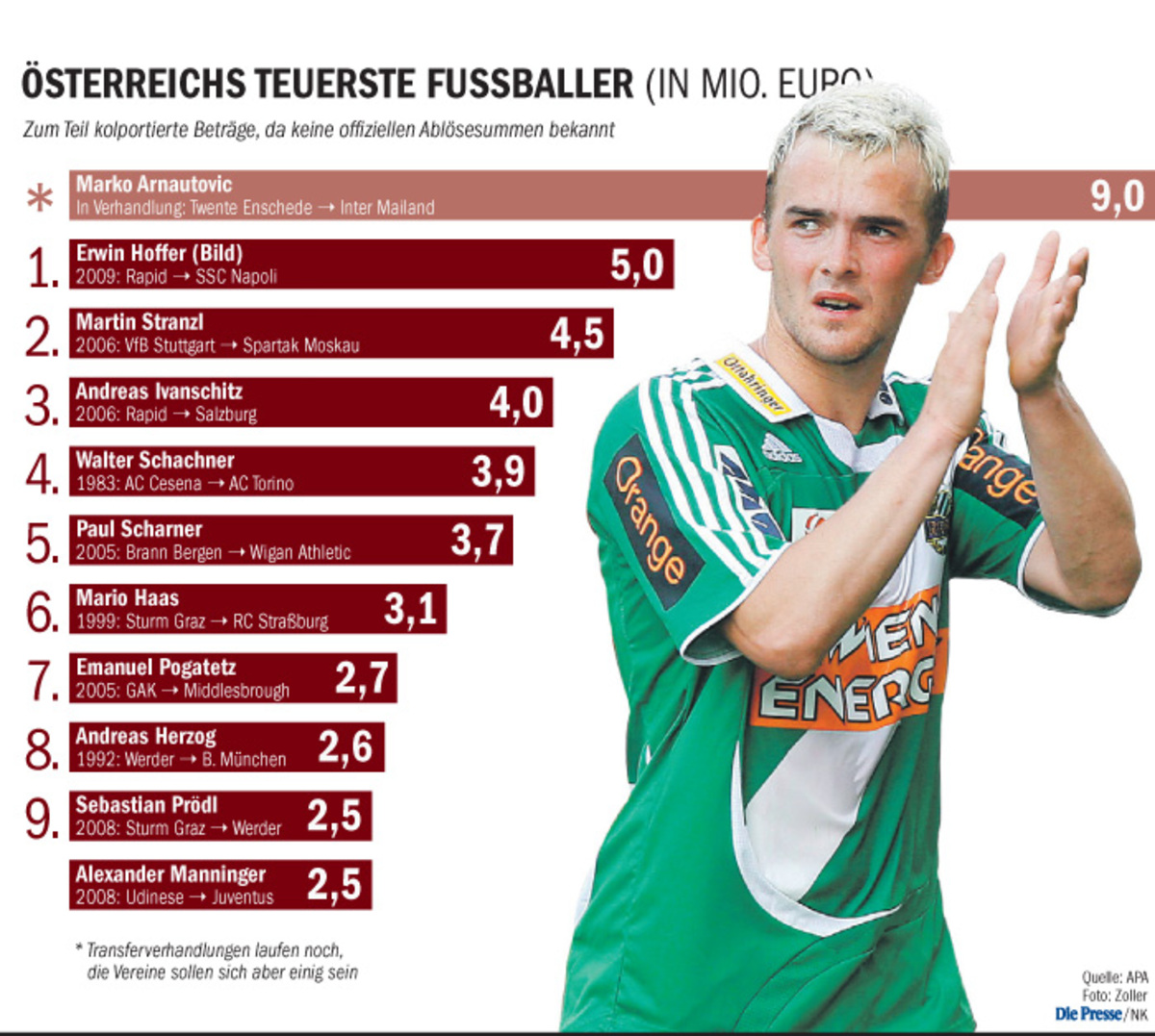 Diese „Auszeichnung“ könnte aber nur von kurzer Dauer sein. Kommt der Transfer von Marko Arnautovic doch zustande, knackt er Österreichs Transferjackpot. Inter Mailand soll gewillt sein, neun Millionen Euro an Twente Enschede zu überweisen. Noch diese Woche soll es so weit sein, die Gespräche wurden zuletzt wieder intensiviert.