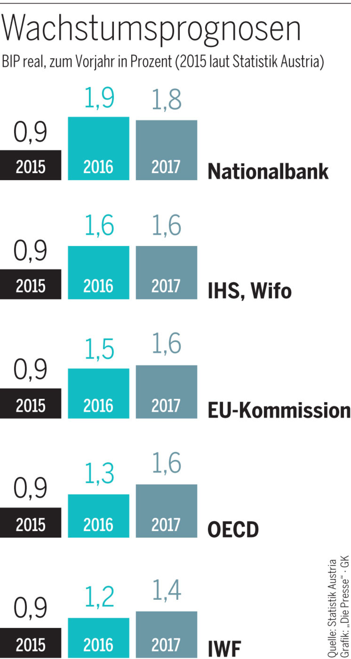 Wien. Auf wie sicherem Fundament ist das österreichische Budget gebaut? Alles steht und fällt mit den Steuereinnahmen, und diese sind in erster Linie von der konjunkturellen Entwicklung abhängig. Hier liegen die Einschätzungen der Experten ziemlich weit auseinander. Am optimistischen sah im Dezember die Nationalbank die Aussichten für 2016: Die OeNB rechnet mit einem Wachstum der heimischen Wirtschaft von 1,9 Prozent. Die beiden größten Forschungsinstitute Wifo und IHS prognostizierten im Gleichklang – und ebenfalls noch vor Weihnachten – schon weniger: 1,6 Prozent. Diese Prognose liegt auch den Budgetplanungen des Finanzministeriums zugrunde.