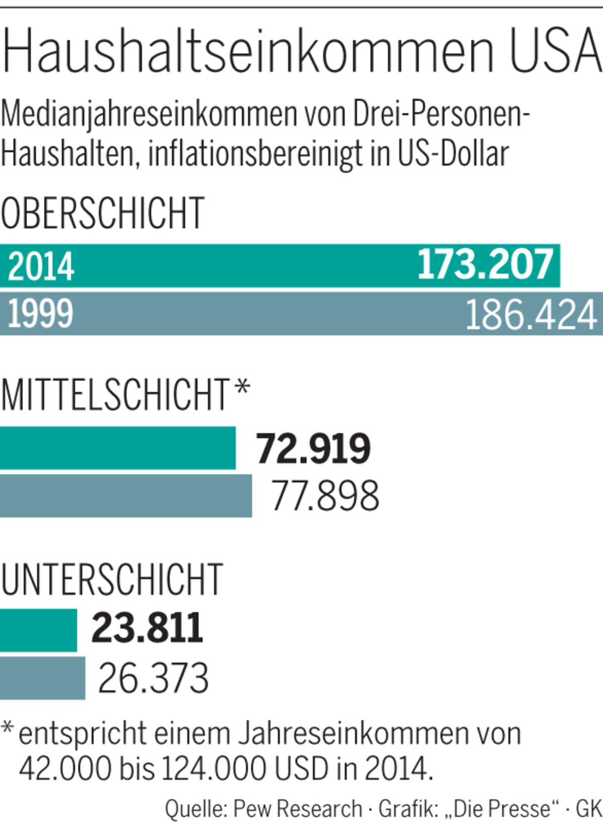 Die große Rezession hat die Medianeinkommen aller drei grob gezeichneten Klassen verringert (siehe Grafik). Zur Mittelschicht zählt nach dieser Berechnung ein Drei-Personen-Haushalt, der zwischen 42.000 und 124.000 Dollar Jahreseinkommen hat. Der Medianwert ist aussagekräftiger als der Durchschnitt, der durch einzelne besonders hohe oder niedrige Einkommen verzerrt wird.