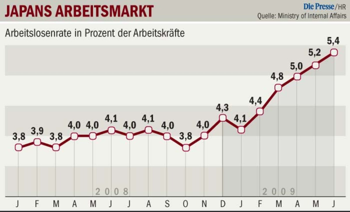 Unvermindert steigt jedoch die Arbeitslosigkeit bei fallenden Gehältern. Das Jahreseinkommen eines durchschnittlichen japanischen Haushaltes ist in den vergangenen zehn Jahren um 7.500 Euro gefallen. Und das spürt der Mann auf der Straße. „Der Aufschwung kommt noch nicht bei den Leuten an“, beklagt im Wahlkampf selbst Premierminister Taro Aso. Die Opposition – nach allen Wahlprognosen klar auf der Siegerstraße – verhöhnt den Regierungschef, er werde ein „Land des Schwächelns“ hinterlassen.