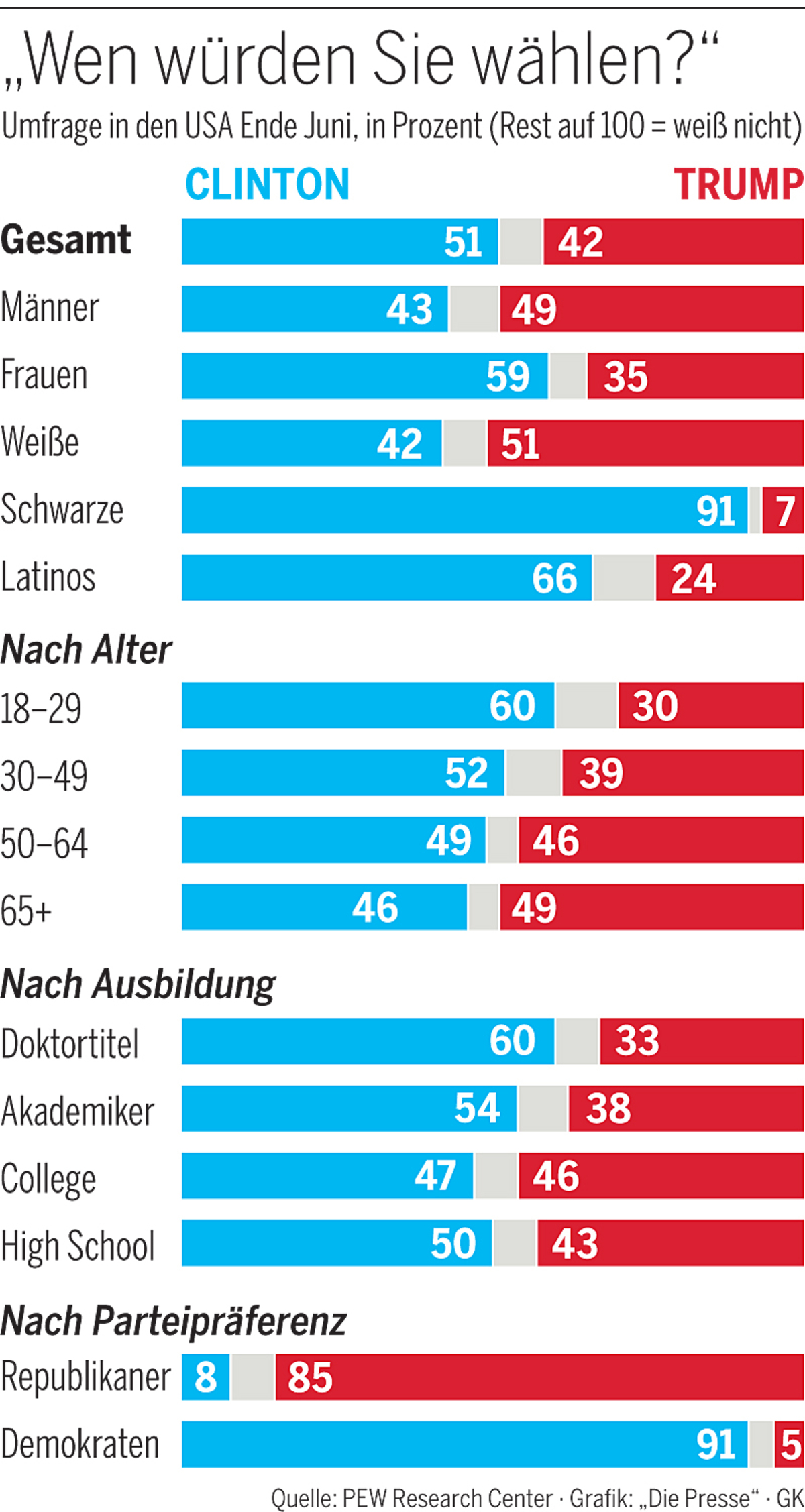 Bei schwarzen, hispanischen und jungen Wählern ist Trump so unbeliebt wie keiner seiner Vorgänger. In den Schlüsselstaaten Ohio und Pennsylvania erhielt er dieser Tage bei Umfragen null (!) Prozent schwarzer Wähler. Bei den Latinos lag Clinton im Juni laut Umfrage des Pew Research Center mit 66 zu 24 Prozent voran. Und laut neuer Umfrage des Harvard Institute of Politics hat Clinton derzeit auch bei den 18- bis 29-Jährigen gegenüber Trump deutlich die Nase vorn. (go)