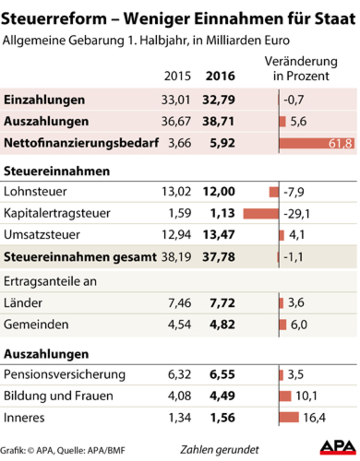 Der Nettofinanzierungsbedarf wuchs von 3,6 auf 5,9 Milliarden, vergleicht man die erste Jahreshälfte 2015 mit jener von 2016. Die Einzahlungen von Jänner bis Juni betrugen laut der Halbjahresstatistik für den Budgetvollzug rund 32,8 Mrd. Euro und sind um rund 217,7 Mio. oder 0,7 Prozent geringer als im Vergleichszeitraum des Vorjahres. Bei der Lohnsteuer gab es Einbußen von gut einer Milliarde Euro, bei der Kapitalertragssteuer von rund 463 Millionen.