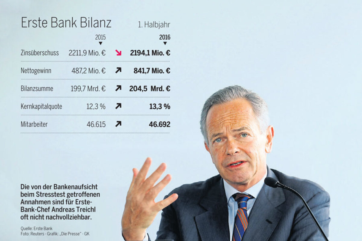 Ganz anders das Bild, das sich bei der Präsentation der Halbjahreszahlen der Erste Bank am Freitag zeigt. Bankchef Andreas Treichl kann nicht nur einen Rekordgewinn für die ersten sechs Monate des Jahres mit einem Nettoüberschuss von 842 Mio. Euro vermelden, auch die Kernkapitalquote – der Ausgangspunkt für den Stresstest – stieg seit dem Ende des Vorjahres von 12,3 auf 13,3 Prozent an.