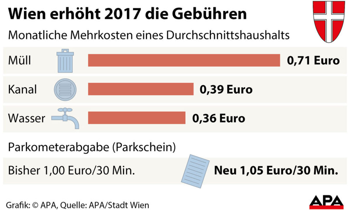 In der Bundeshauptstadt Wien wird man kommendes Jahr für maßgebliche Gebühren mehr zahlen müssen: Erhöht werden die Tarife für Wasser, Abwasser (Kanal) und Parken. Auch die Müllabfuhr wird - abgesehen von der erst heuer angepassten Containerabholung - ab 1. Jänner 2017 teurer. Zudem muss für eine Reihe von Gebrauchsabgaben tiefer in die Tasche gegriffen werden.