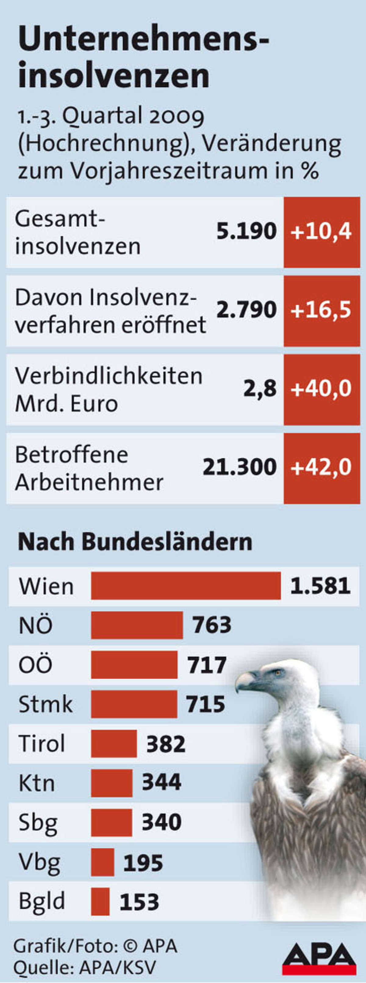 In den ersten neun Monaten 2009 schlitterten mit 5190 Firmen in die Insolvenz, das sind um 489 mehr als 2008. Bei den Privatinsolvenzen war der Anstieg mit 7,9 Prozent auf 6880 Fälle geringer.