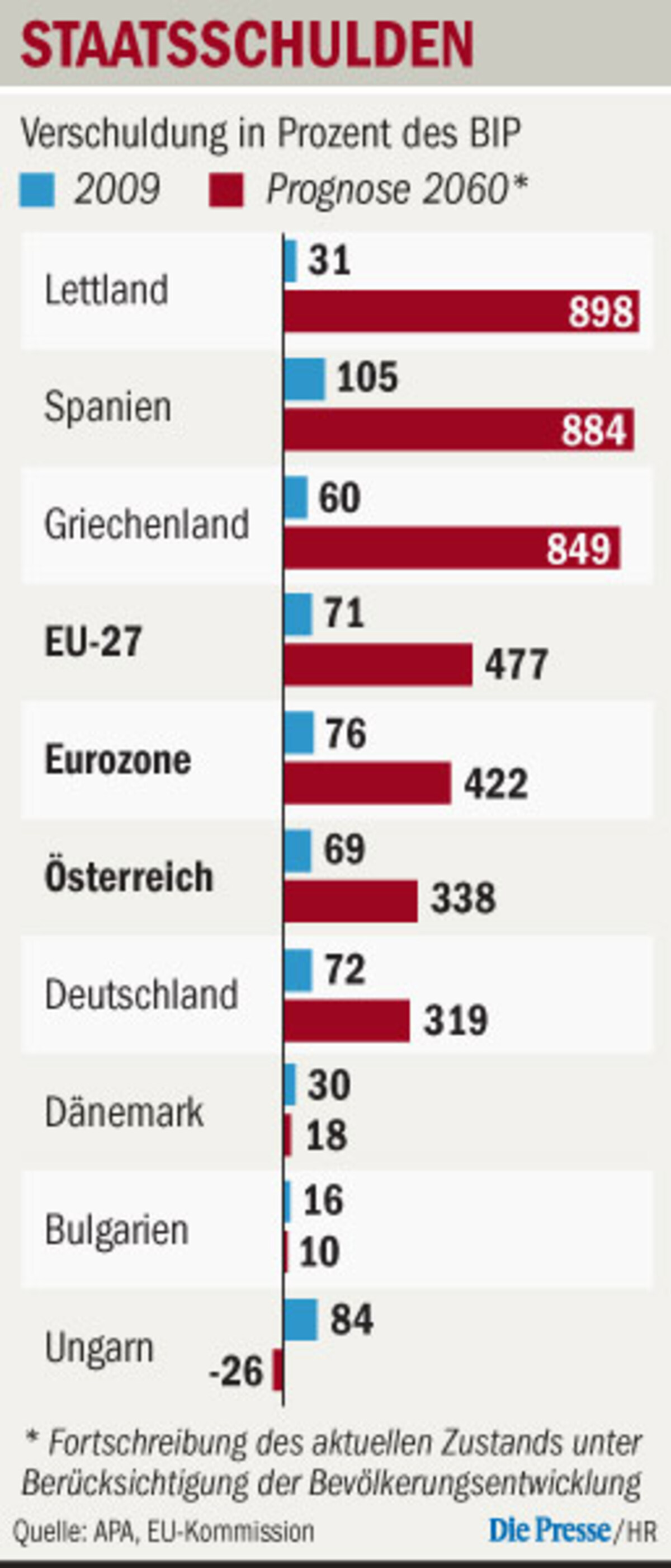 Die Projektion gilt freilich als bloße Zahlenspielerei, weil sie eine schlichte Fortschreibung des derzeitigen Zustands über 51 Jahre (allerdings unter Berücksichtigung der demografischen Entwicklung und der daraus entstehenden Pensionslasten) ist. Es ist sozusagen ein Szenario, das zeigen soll, was passiert, wenn 50 Jahre lang nichts passiert. In der Praxis ist das schon deshalb nicht möglich, weil Staaten wie Litauen, Spanien oder Griechenland wohl schon lange vor Erreichen von Schuldenständen zwischen 800 und 900 Prozent des BIP (siehe Grafik) in den Staatsbankrott schlittern würden.