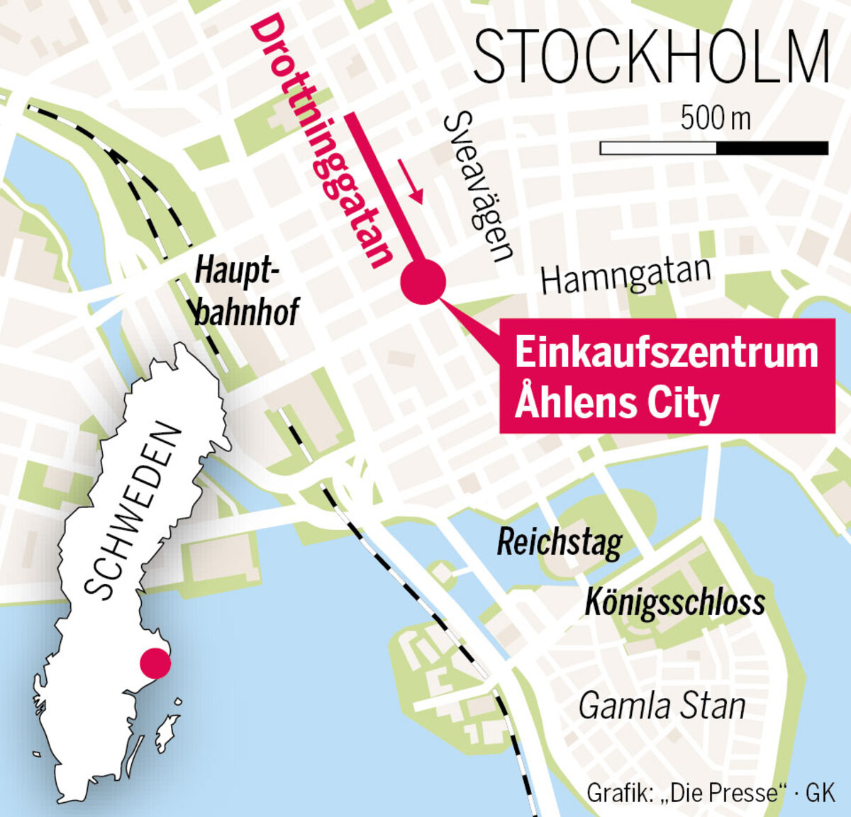 Der Schock ist gewaltig im frühlingshaft warmen Stockholm. Am Freitagnachmittag, kurz vor 15.00 Uhr, fuhr ein Lastwagen über die Fußgänger-Einkaufstraße Drottninggatan und krachte in das Kaufhaus „Åhléns City“. Dabei wurden laut vorläufigen Informationen der Polizei vier Menschen getötet, 15 Menschen wurden teilweise schwer verletzt, darunter auch zwei Kinder. „Es war überall Blut. Ich sah zwei zerfetzte Körper und versuchte einem Dritten zu helfen, das ging aber nicht. Ich beugte mich über ihn und schloss seine Augen“, erzählt Augenzeuge Martin Svenningsen. Es war eine Szene, die an die Lkw-Anschläge im französischen Nizza im Juli 2016 und in der deutschen Hauptstadt Berlin im Dezember erinnerte.