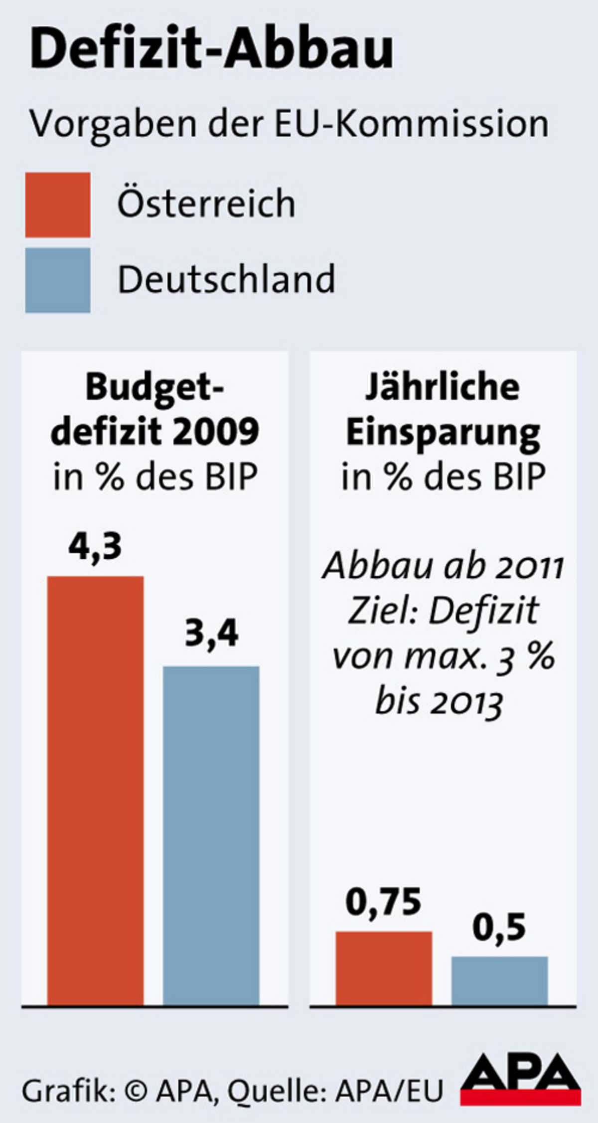 Österreich wird laut EU-Herbstprognose in diesem Jahr einen Budgetabgang von 4,3 Prozent aufweisen. Die Kommission fordert nun Österreich auf, ab 2011 jährlich 0,75 Prozent des Bruttoinlandsprodukts an Budgeteinsparungen vorzunehmen, um eben 2013 auf die gewünschten Kriterien zu kommen. Besser geht es Deutschland, das bei einem Defizit von 3,4 Prozent 2009 zur Bereinigung seiner Situation lediglich eine jährliche Reduktion von 0,5 Prozentpunkten aufgebrummt bekommen hat. Auch Italien mit einem Abgang von 5,3 Prozent für das heurige Jahr soll nur 0,5 Prozentpunkte pro Jahr reduzieren müssen, das aber ab 2010.