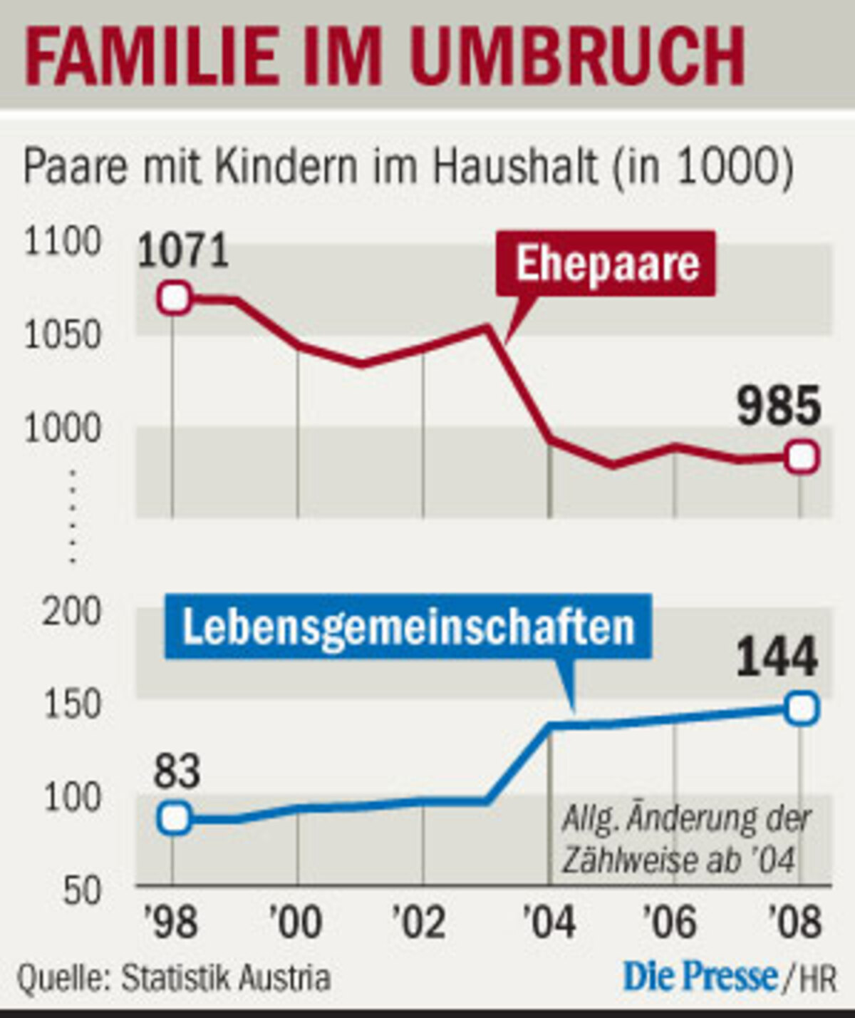 An der Rechtslage in Österreich, wo – dem globalen Trend entsprechend – immer mehr Kinder unehelich geboren werden (s. Grafik), ändert das Urteil aber unmittelbar nichts, wie Verfassungsrechtler Heinz Mayer (Uni Wien) betont. Allerdings ist bereits ein Obsorgestreit aus Österreich in Straßburg anhängig. Unabhängig davon könnte das neue Urteil aber schon Auswirkungen haben, bevor der Fall aus Österreich entschieden ist. Weil die Europäische Menschenrechtskonvention im Verfassungsrang steht, müssen Gerichte österreichische Gesetze im Einklang mit ihr (und ihrer Auslegung durch Urteile) interpretieren. Gehe das nicht, sagt Mayer, werde sich ein Gericht der zweiten Instanz bei einem vergleichbaren Obsorgefall wegen Zweifels an der Verfassungsmäßigkeit der heimischen Gesetze an den Verfassungsgerichtshof wenden müssen. Trotzdem: Ein solcher Prozess sei langwierig und für den Betreffenden ein Risiko, sagt der Familienrechtsexperte Günter Tews, denn auf Grund der Dauer bringe er „im konkreten Fall oft nichts“. Tews selbst, der sich immer wieder für Väter einsetzt, ist jedenfalls „hocherfreut“ über das Urteil gegen Deutschland: „Der erste Stein in der Mauer bröckelt.“