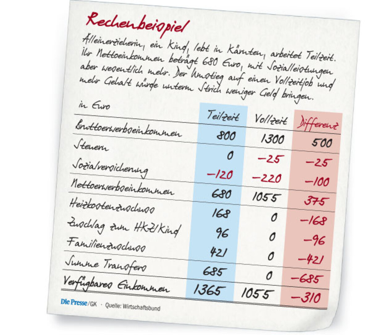 Mit einem Beispiel versucht der Wirtschaftsbund das zu verdeutlichen: Eine Alleinerzieherin, die für einen 20-Stunden-Teilzeitjob 800 Euro brutto erhält, zahlt keine Steuern und kommt mit allen Sozialleistungen (von Heizkosten- bis Familienzuschuss) auf netto 1365 Euro. Verdient sie hingegen für einen Vollzeitjob 1300 Euro brutto, bleiben unterm Strich nur 1.055 Euro übrig, weil sie einerseits in die Steuerpflicht gerutscht ist, andererseits die Einkommensgrenze für bestimmte Förderungen überschritten hat (siehe Grafik). Warum sollte sie also mehr arbeiten? Soll die Summe der Zuwendungen von Bund, Ländern und Gemeinden mit einer Höchstgrenze versehen werden? Für den ÖVP-Politiker ist das vorstellbar.