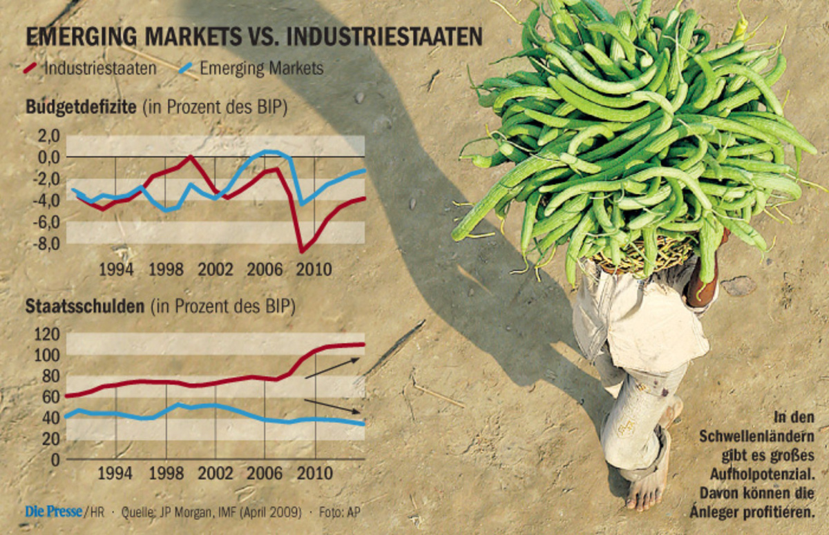 • Aktien: „Die Kurse werden zu Beginn des Jahres noch steigen, weil die Liquidität in den Märkten noch groß ist und die Zinsen weiter am Boden sind“, prognostiziert UniCredit-Expertin Monika Rosen. Die Kursanstiege würden aber nicht das ganze Jahr anhalten. Man müsse sich rechtzeitig überlegen, wann man aus riskanten Aktien aussteigt oder in defensive Werte umschichtet, so Rosen. Die Experten der RCM sind deutlich auf Schwellenländer (Emerging Markets), verstärkt aus Asien, fokussiert. Aigner sieht in diesen Ländern die meisten Potenziale, da sie besser aufgestellt seien. Die Budgetdefizite und Staatsschulden sind deutlich geringer als bei den Industriestaaten.