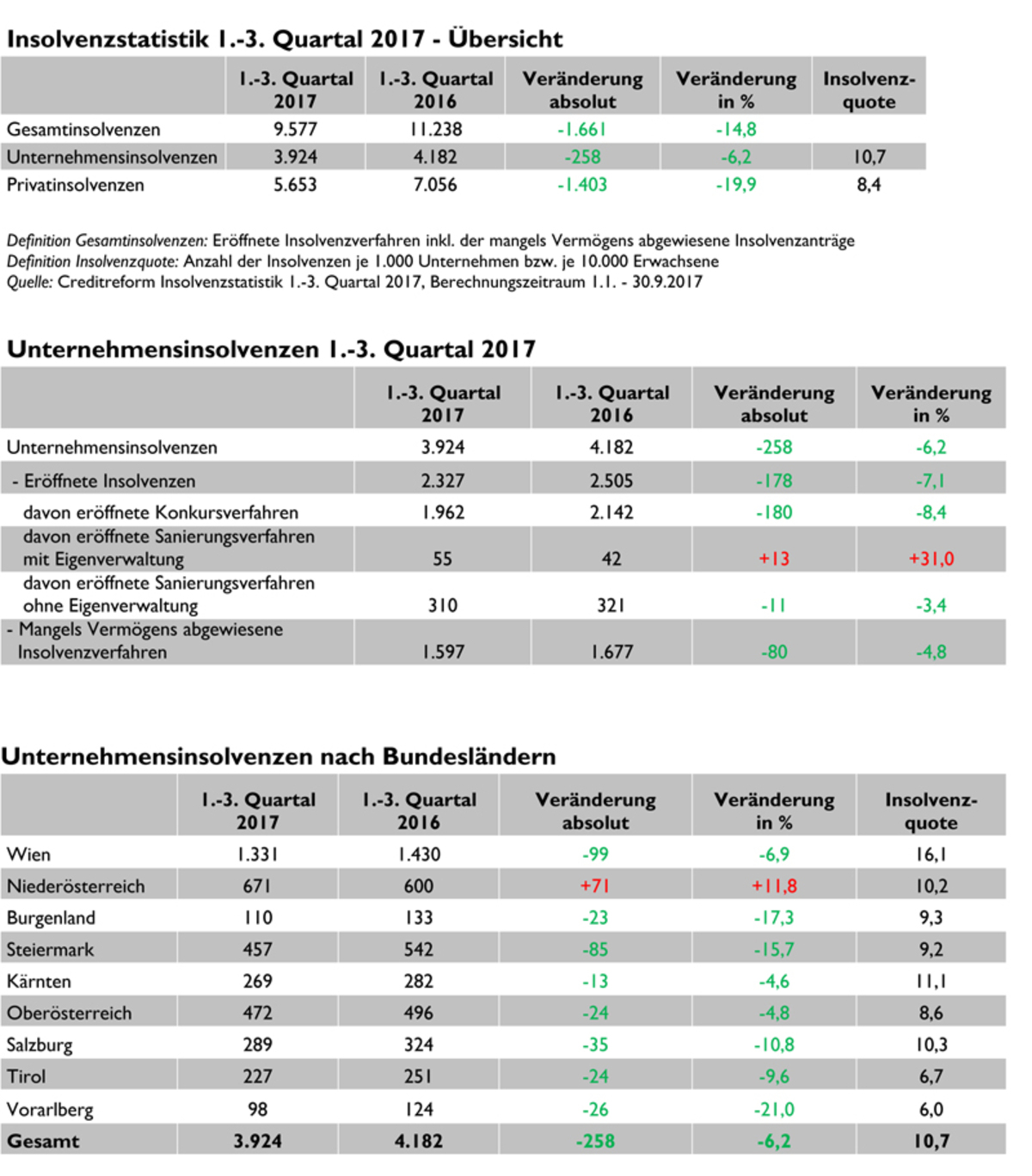 Auch die Insolvenzstatistik des Gläubigerschutzverbandes Creditreform zeigt für die ersten drei Quartale heuer also einen Rückgang bei Firmen- und vor allem bei Privatinsolvenzen. Unternehmensinsolvenzen wurden mit 2.327 um 7,1 Prozent weniger eröffnet. Das ist der niedrigste Stand seit 10 Jahren. Privatpleiten wurden mit 4.796 um 22,6 Prozent weniger eröffnet.