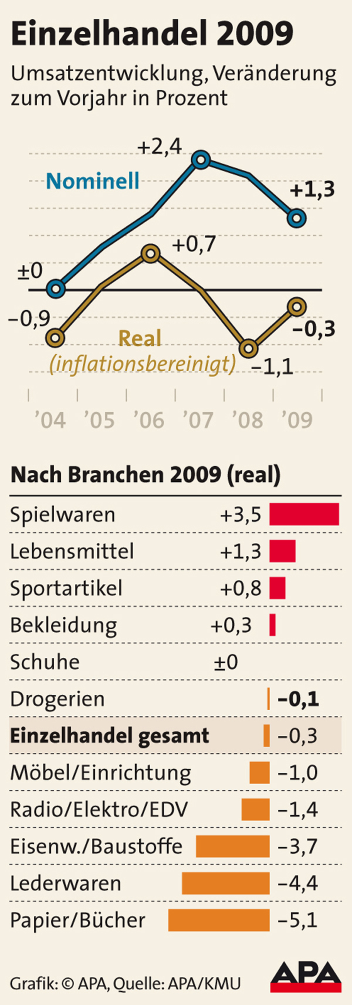 Im Jahr 2009 erzielten Österreichs Einzelhändler einem Umsatz von 48,6 Milliarden Euro. Das sind real um 0,3 Prozent weniger als noch 2008. Das starke zweite Halbjahr konnte die Einbrüche des ersten nicht ausgleichen.