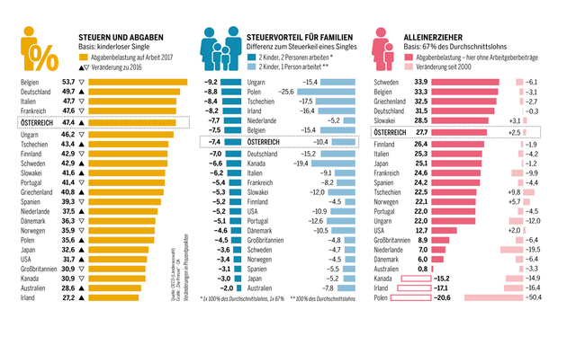 Die Abgabenlast auf Arbeit steigt wieder. Nur neue Strukturen könnten Österreichs Position im OECD-Ländervergleich verbessern. Weitere Denkanstöße: Wirkt die Familienbegünstigung? Hat man auf Alleinerziehende vergessen?