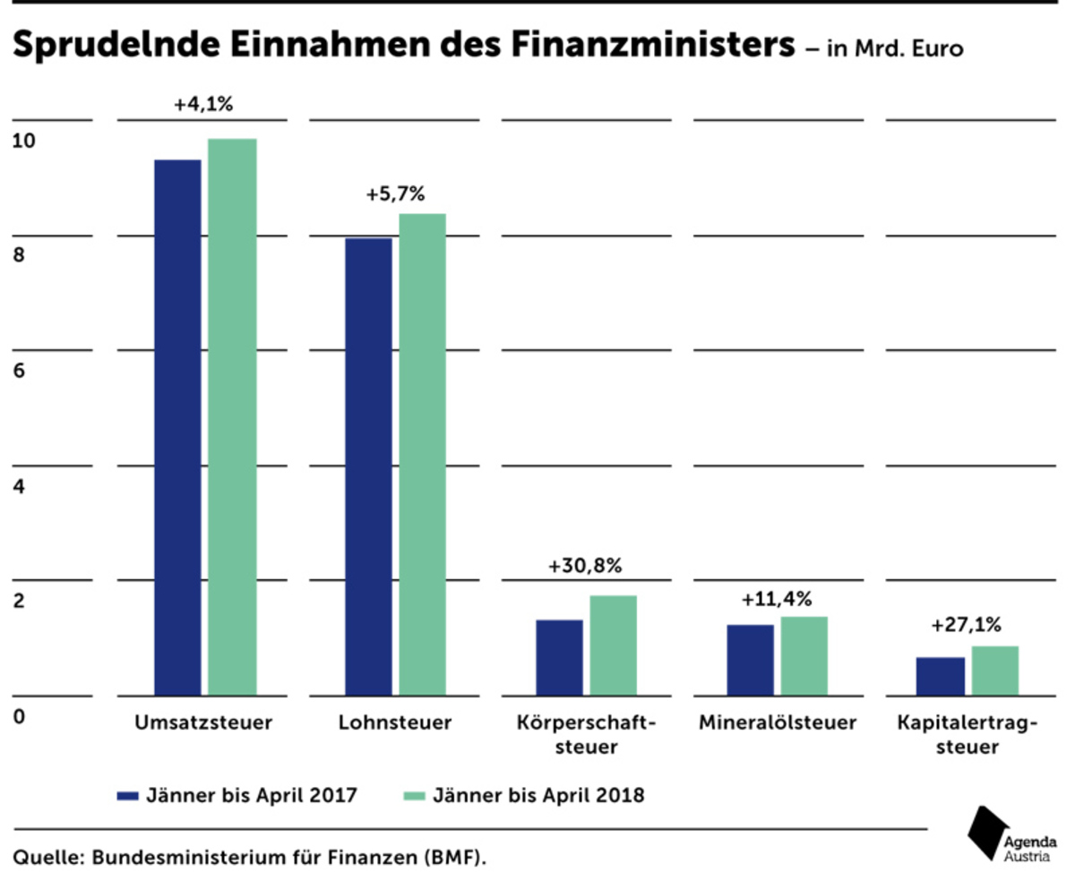 Auf der anderen Seite haben die Staatseinnahmen zugelegt. So liegen die Steuererlöse im ersten Halbjahr 2018 laut aktuellen Zahlen des Budgetvollzugs deutlich über Plan. Die wesentlichen Positionen Einkommens- und Vermögenssteuer sind um 3,2 Prozent gestiegen. „Die Hochphase der Konjunktur ist auch 2018 bei den Steuereinnahmen angekommen“, sagt Ökonom Sustala.