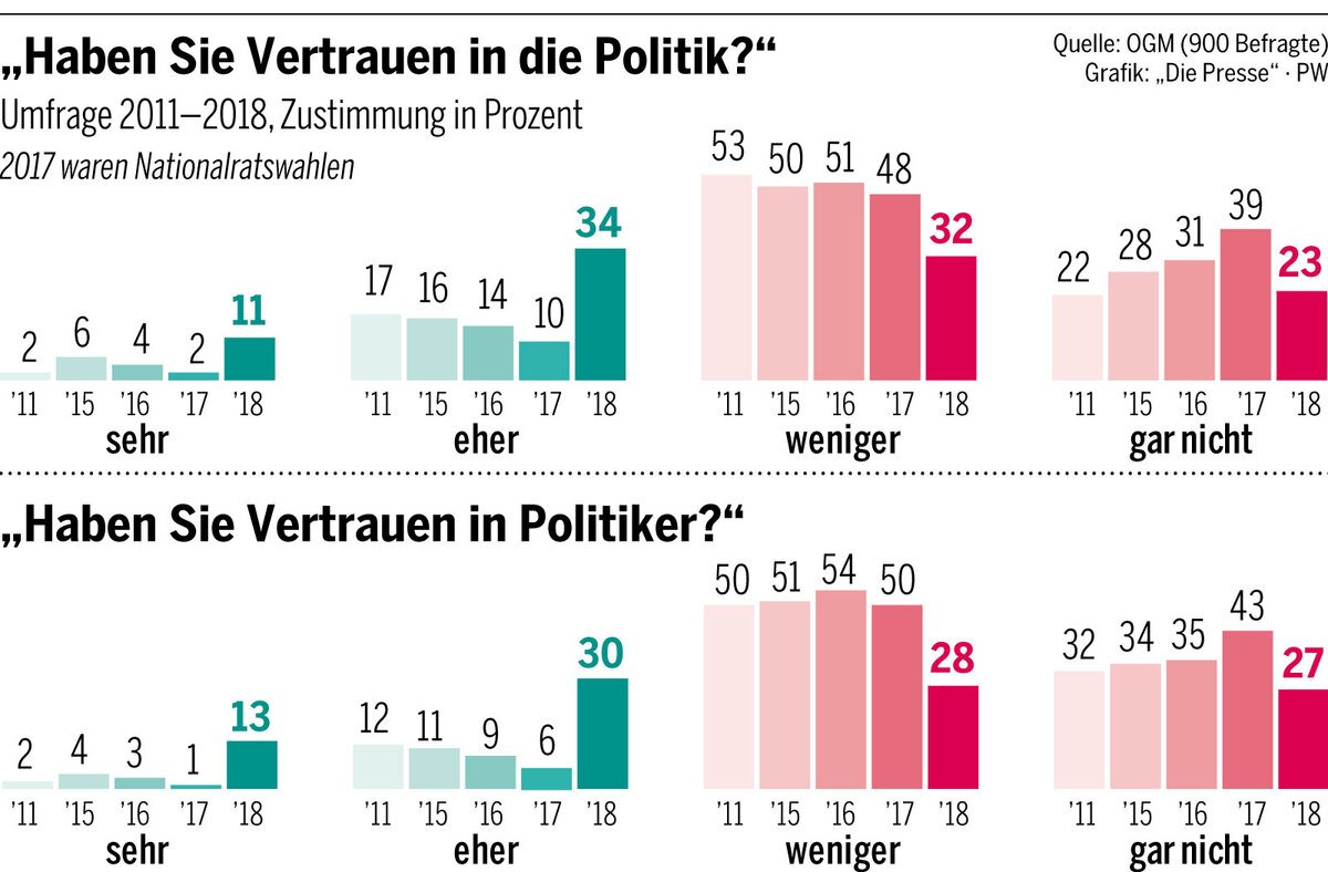 So stieg der Anteil jener Personen, die der Politik sehr oder eher vertrauen gegenüber dem Vorjahr von zwölf auf 45 Prozent. Immer noch misstraut aber der Großteil der Österreicher der Politik. Ähnliche Ergebnisse erhält man, wenn man das Vertrauen in die Politiker selbst abfragt. Auch hier stieg das Vertrauen („sehr“ oder „eher“) deutlich von sieben auf 43 Prozent, das Misstrauen gegenüber den Volksvertretern überwiegt aber auch hier weiterhin.
