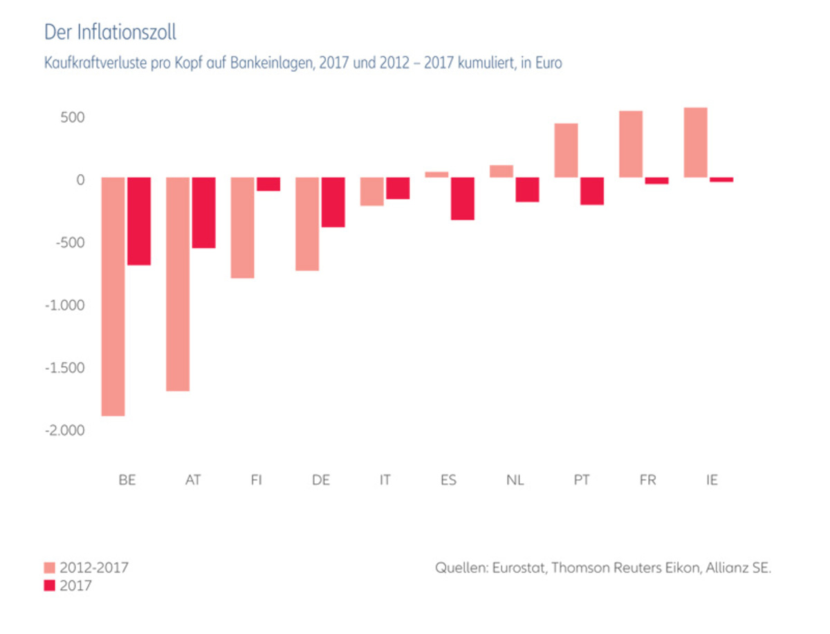 Wegen der Rückkehr der Inflation ist die Rendite im letzten Jahr überall unter den langjährigen Durchschnitt gefallen, teilweise – wie in den Niederlanden und Irland – sogar unter die Nulllinie. Insbesondere Sparer mit einer hohen Präferenz für Bankeinlagen spüren inzwischen die (schädliche) Wirkung der Inflation: Sie erzielen mit ihren Bankeinlagen mittlerweile negative Renditen. Die dabei erlittenen Kaufkraftverluste reichen von 670 Euro pro Kopf in Belgien und 540 Euro in Österreich bis zu rund 50 und 30 Euro pro Kopf in Irland und Frankreich.