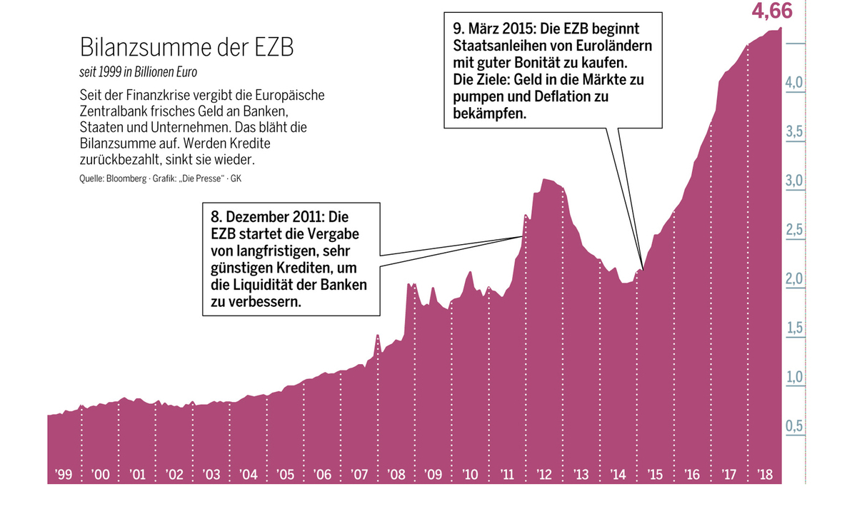 Schon bei der Sitzung an diesem Donnerstag erwarten die Analysten hierzu ein Signal aus Frankfurt. Laut Plan soll das Ankaufprogramm beendet werden und – erst mal – 2600 Milliarden nicht übersteigen. Das ist der Wert jener Anleihen, die die EZB seit 2015 in ihre Bücher genommen hat. Das erklärte Ziel: Bekämpfung der Deflationsgefahr und Wahrung der Preisstabilität. Obwohl die EZB vor allem Staatsanleihen gekauft hat, handelt es sich in den Augen der Notenbanker nicht um illegale Staatsfinanzierung, weil a) nach einem festgelegten Schlüssel gekauft wurde, nicht ausgerichtet am Finanzbedarf der Staaten, und b) keine schlechten Papiere wie etwa griechische gekauft wurden. Die Richter vom EuGH bestätigen auch diese Sicht und geben der EZB Rückendeckung.