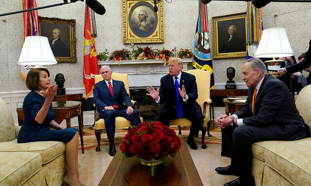 "Bizarr, erbittert", beschreibt der britische "Guardian" die Szenen, die sich am Dienstag im Oval Office des Weißen Hauses abgespielt haben. Wie ein Streit zweier New Yorker um ein Taxi sei es gewesen. 20 Minuten lieferten sich US-Präsident Donald Trump und die Fraktionschefs der Demokraten im Senat und im Repräsentantenhaus, Chuck Schumer und Nancy Pelosi, einen Schlagabtausch vor laufenden Kameras. Das Thema: der von Trump geforderte Mauerbau an der Grenze zu Mexiko.
