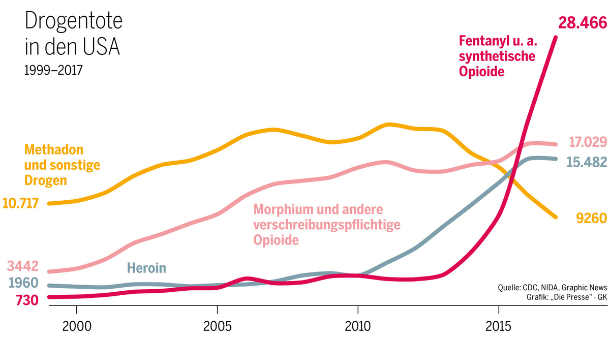 New York. Die Epidemie betrifft alle Bevölkerungsschichten und alle Altersgruppen: Seit Monaten versuchen Experten diese Nachricht in verzweifelten Appellen unter die Leute zu bringen. Kinder aus wohlhabenden Vorstadtfamilien sterben ebenso wie Prominente in Hollywood, Geschäftsleute in Manhattan oder Asylsuchende in Texas, die die Beipackzettel der Medikamente nicht lesen können. Insgesamt fordert die Opioidkrise in den USA mehr als 45.000 Menschenleben. Pro Jahr.