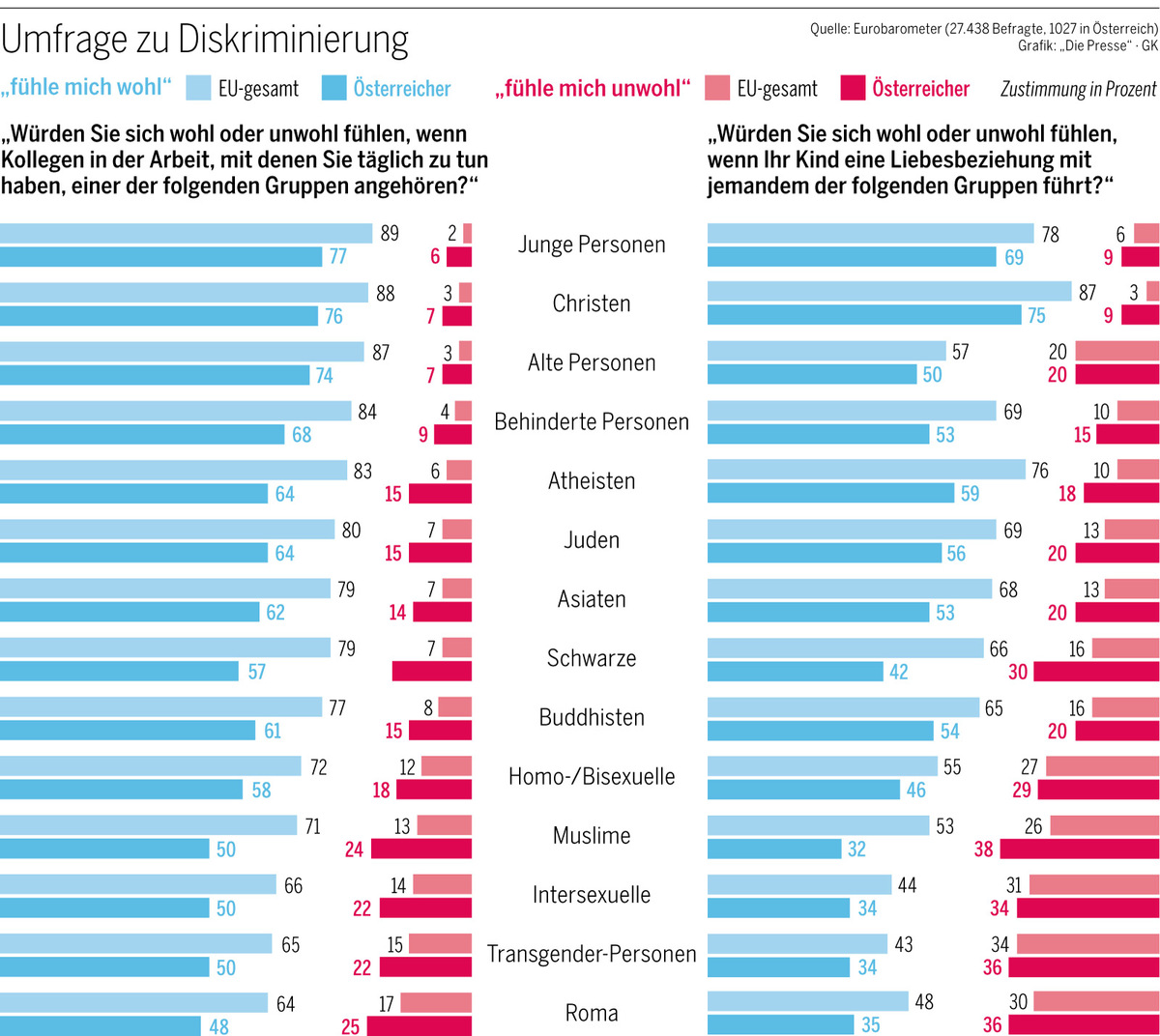 Wien/Brüssel. Ob Muslime, Juden, Roma oder Personen mit anderer sexueller Orientierung: Sie haben es in Österreich nach wie vor besonders schwer, in der Öffentlichkeit, in der Arbeitswelt oder im privaten Umfeld als gleichberechtigter Teil der Gesellschaft akzeptiert zu werden. Das belegt eine am Donnerstag veröffentlichte Studie, die von der EU-Kommission in Auftrag gegeben wurde.