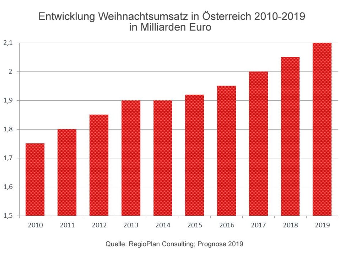 Das heurige Weihnachtsgeschäft wird allen Unkenrufen über schwache wirtschaftliche Aussichten zum Trotz um zwei Prozent legen, was bei einer Inflation von 1,6 Prozent real eine Zunahme bedeutet. Absolut bedeutet das Ausgaben von 2,1 Milliarden Euro. Jedoch verschieben sich die Anteile der einzelnen Segmente deutlich. Die großen Profiteure dieser Veränderung werden das Online-Shopping und die Weihnachtsmärkte sein, die Bedeutung der Das prognostiziert Handelsberater RegioPlan in seiner Analyse über die Weihnachtsumsätze 2019.