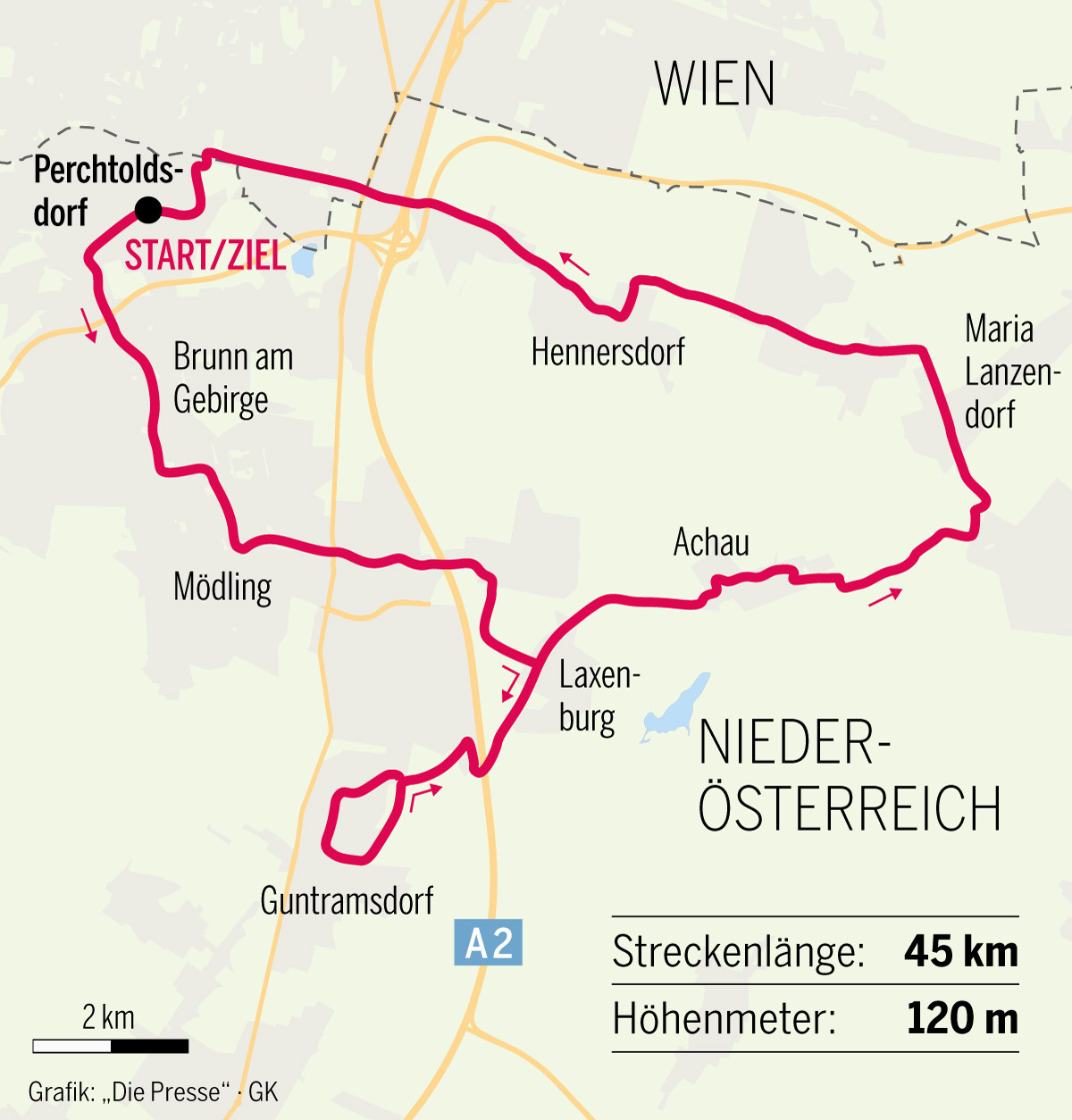 Also rauf aufs Fahrrad, obwohl es wieder ein nebelverhangener kalter Morgen ist. In der Absicht, eine flache Runde südlich von Wien zu drehen, starte ich Richtung Wiener Neustädter Kanal. Die dünne Schneedecke in Mödling habe ich zu Hause, wo alles staubtrocken war, nicht einkalkuliert. Obwohl sie Kraftfutter für den inneren Schweinehund ist (dreh doch um!), fahre ich unbeirrt weiter. Die Runde verläuft dann trotzdem nicht ganz so, wie ich sie mir routentechnisch vorgestellt habe. Nach einer – gemessen am Vorhaben, voranzukommen – sinnlosen Schleife in Guntramsdorf klinke ich mich zufällig in den „Weg der Ziegelbarone“ ein, voriges Jahr eröffnet und übrigens wieder eine Rundtour. Die Frage, warum die Herrschaften damals, als hier alles der Ziegelproduktion untergeordnet war, Runden absolviert haben sollen, muss unbeantwortet bleiben. Mir reicht, dass der Weg durch Vösendorf und damit zurück an die Stadtgrenze führt. „Die Richtung stimmt!“, denke ich mir – und fahre trotzdem weiter, sogar nach Hause. Warum ich meine Runden drehe, glaube ich ja zu wissen.