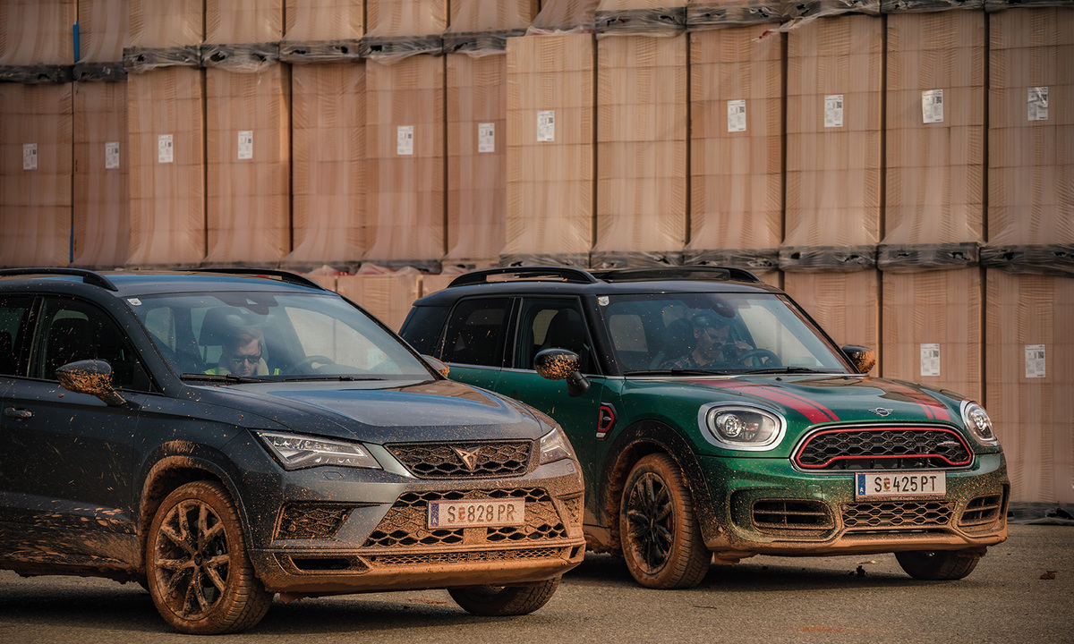 Cupra Ateca und JCW-Countryman haben viele Gemeinsamkeiten, wobei der Ateca etwas größer und schwerer ist und über ein Doppelkupplungsgetriebe mit sieben Gängen verfügt, während es beim Mini eine Achtgangautomatik ist. Beide als Fronttriebler ausgelegt, schaltet sich die Hinterachse erst bei Schlupf an den Vorderreifen dazu. Die Idee, dass ein SUV oder Crossover einen Sportwagen abgeben könnten, ist natürlich abwegig, denn die beiden zentralen Kriterien für ein solches Format sind geringes Gewicht und geringer Schwerpunkt, und beide sind ja nicht eben die Stärken der höher gelegten, robust ausgeführten Gattung. Aber ein kräftiger Motor und ein kundig ausgelegtes Fahrwerk können ihren Beitrag für kurzweilige Kurvenfahrt leisten. Dass der Cupra den Mini beim Temperament übertrifft, ist vielleicht überraschend, sein Motor greift mit größter Freude durch. Der Mini ist einen Hauch knackiger abgestimmt, in letzter Konsequenz auf sicheres Untersteuern im Grenzbereich ausgelegt. Beide geben sich im Alltag ausreichend komfortabel und drängen nicht zu unruhiger Fahrweise. Die Programme des Cupra sehen sogar einen Rennstreckenmodus vor. Der Sportmodus im Mini macht hauptsächlich das Brumm-Brumm lauter. Größter Vorteil der beiden ist, dass man bei Bedarf auch einen Schwung Ziegel einpacken kann, und dass man die Trümmer zu Hause hat, solang sie noch schön warm sind.