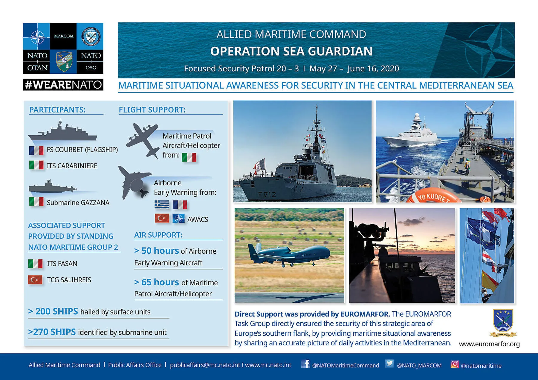 Im Rahmen von Sea Guardian, gegründet 2016, geht es grundsätzlich um die Überwachung des Mittelmeers, den Einsatz gegen Piraten, Terroristen, Schmuggler etc. Der Stab der Operation befindet sich in Northwood nahe London. Die aktuellen Kräfte zur See umfassten zuletzt neben der nun ausscheidenden Courbet die italienischen Fregatten „Carabiniere" und „Virginio Fasan", ein italienisches U-Boot sowie just ein türkisches Schiff, die Fregatte „Salih Reis". In der Luft sind Aufklärer und Drohnen der Franzosen, Italiener, Griechen und Türken aktiv.