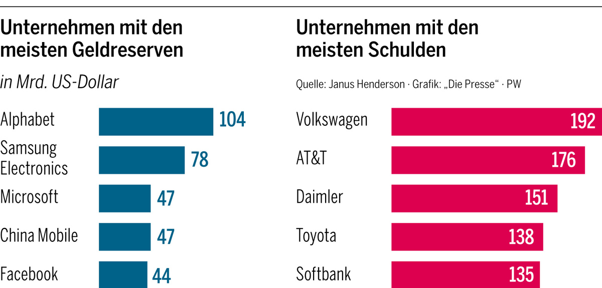 Doch nicht alle Unternehmen setzen auf Fremdkapital. Ein Viertel ist schuldenfrei, einige Firmen verfügen sogar über Barreserven. An der Spitze steht die Google-Mutter Alphabet mit Beständen von 104 Milliarden US-Dollar.