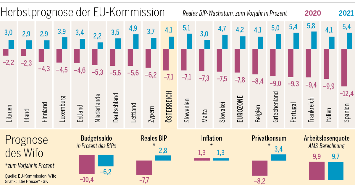 Etwas positiver fällt die Prognose der EU-Kommission aus. Sie rechnet für Österreich weiter mit einem Rückgang der Wirtschaftsleistung von 7,1 Prozent und erwartet im kommenden Jahr immerhin noch ein Wachstum von 4,1 Prozent. Im Sommer lag dieser Wert noch bei 5,6 Prozent.
