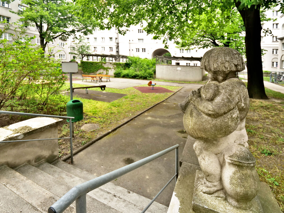 Kein Zweifel, Eindruck macht er, der Fuchsenfeldhof, seines Zeichens einer der ersten Großgemeindebauten des Roten Wiens. Und aufs Erste scheint er auch halbwegs ordentlich in die Gegenwart gekommen zu sein. Stimmt schon, das vormalige Kinderfreibad ist längst einem eher simplen Spielplatz gewichen, und der Einbau der Liftanlagen in den 1990ern hätte sich eleganter gestalten lassen, aber sei's drum.
