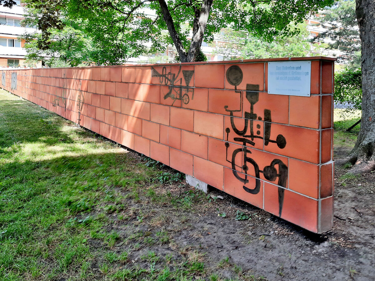 Ja, die gemeindeeigene Wohnhausanlage Hartlebengasse 1–17 ist mir seit Jahrzehnten wohlbekannt; jedenfalls hätte ich das bis vor Kurzem gedacht, bin ich doch schon in Kindheitstagen unzählige Male an ihrer Front zum Stadlauer Hausgrundweg hin entlanggegangen. Doch offenbar nur an dieser Front entlang, gequert kann ich die Anlage nicht haben, sonst wäre gerade dem Kind jenes Stück blitzblaue Sommerfreude sicher nicht verborgen geblieben, das mir nun, der Kindheit seit Längerem entraten, beim zufälligen Vorbeikommen sofort bemerkenswert schien: ein Element zumal, das Wien-weit – bedauerlicherweise – nicht Seinesgleichen hat.
