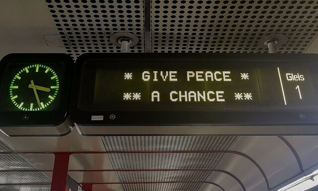 Wo sonst neben den Wartezeiten höchstens „Stau in der Zufahrt“ oder eine Aufforderung zum Tragen von FFP2-Masken steht, auf den Leuchttafeln der Wiener Verkehrsbetriebe nämlich, dort stand in den vergangenen Tagen ein Imperativ, der ursprünglich ein Songtitel war: „Give Peace a Chance“.