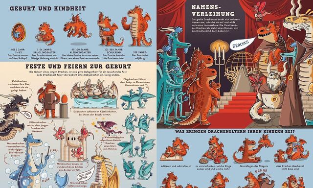 In dem Wimmelbuch sieht man etwa detailliert, was mit entzündlichen Gasen im Magen von Vulkandrachen passiert. Wie Höhlendrachen an den Decken hängen, Flugdrachen an Regenbogen naschen oder Wüstendrachen vorbeikommenden Reisenden Rätsel aufgeben. Es gibt Minidrachen, die Häuser aus Zuckerwürfeln bauen und Wandeldrachen, die ihre Gestalt ändern. Von den Eiern der Drachen (Vorsicht, manche können Menschen in goldene Statuen verwandeln) über Feste zur Geburt und der allgemeinen Erziehung bis zum Altenheim wird da allerlei Faktisches dargeboten: Ein witziges Potpourri der sonderbaren Sitten, das vor allem durch seine fröhlich-bunten Illustrationen überzeugt.