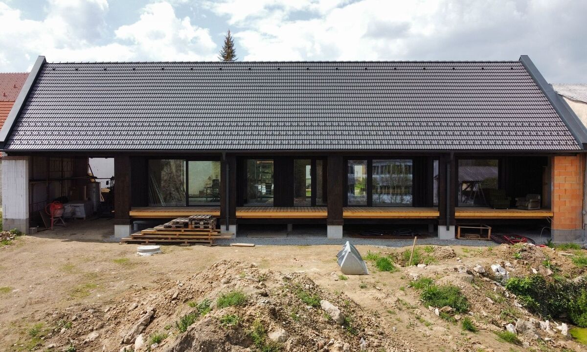 Begonnen wurde im August 2021 mit dem Abriss des Stadels, an dessen Stelle im September des gleichen Jahres das neue Haus Gestalt anzunehmen begann. Beim Material entschied man sich für eine Holzriegelbauweise, „weil das ökologisch ist und durch die Vorfertigung der Teile einen zügigen Baufortschritt versprach“. Ökologische Überlegungen spielten auch eine Rolle bei der Entscheidung für ein Punkt-Streifenfundament: „Das muss man sich als eine Art Pfahlbau vorstellen. Es war uns wichtig, dass der Boden atmen kann und nicht durch Beton versiegelt wird“, erläutert Winkler. Als Vorbild hierfür diente das Nationalparkhaus Thayatal. Die Dämmung besteht aus Zellulose, geheizt wird mit einer Luftwärmepumpe, die von einer Fotovoltaikanlage mit Strom gespeist wird.