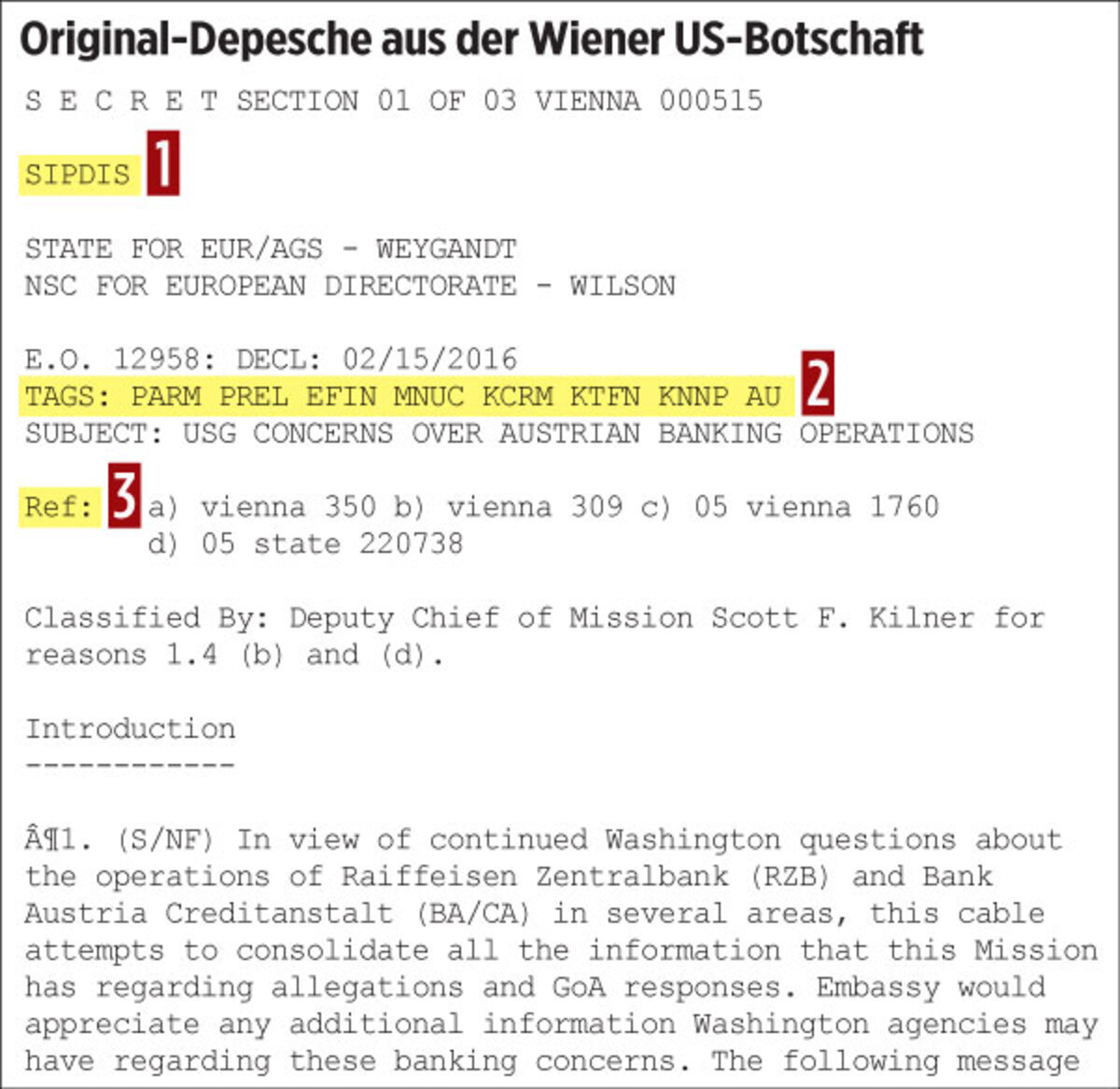 WIEN/MOSKAU/EST/red. Nun wurden auf der Enthüllungs-Plattform WikiLeaks die ersten Geheimdepeschen aus der US-Botschaft in Wien freigeschaltet: Die Dokumente mit den Referenznummern 05VIENNA3833 (7.12.2005) und 06VIENNA515 (17.2.2006) enthalten durchaus brisantes Material – vor allem, wenn man US-Depeschen aus anderen Botschaften dazu liest. In den Wiener Depeschen geht es um mögliche Kontakte zur Ostmafia, Hilfe für die Regimes des Iran und Nordkoreas und um Abwicklung der Gelder mutmaßlicher Untergrundgruppen aus dem Nahen Osten. Die Amerikaner interessierten sich dabei vor allem für die Rolle der österreichischen Banken.