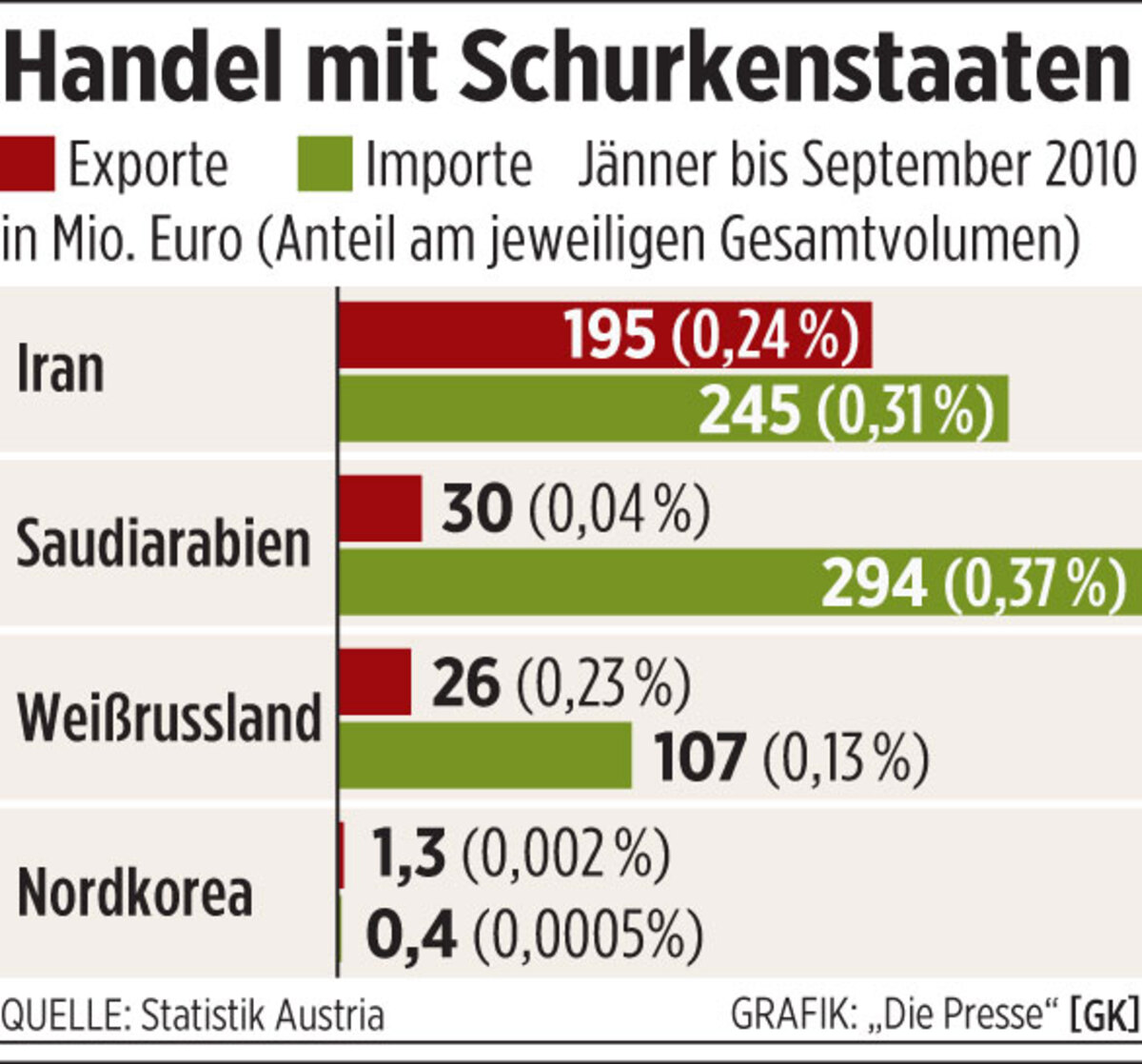 In deutlich größerem Umfang verkehren Waren und Dienstleistungen zwischen Österreich und dem Iran. Das Handelsvolumen in den ersten drei Quartalen beläuft sich auf 440Mio. Euro. Das ökonomische Nahverhältnis mit dem Erzfeind der USA war der Supermacht bereits mehrmals ein Dorn im Auge. Eine Anfang Dezember enthüllte Depesche der Plattform WikiLeaks besagt, dass die Creditanstalt im Jahr 2006 Zahlungen der Firma Novin Energy abgewickelt hatte.