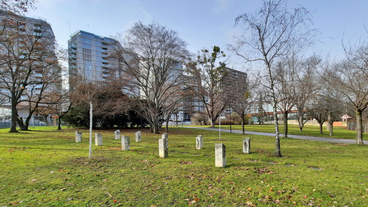 Im Schweizergarten befindet sich ein Kunstwerk besonderer Art: eines, das es offiziell gar nicht gibt, jedenfalls nicht für einschlägige Verzeichnisse der Stadt. Und an das demnächst auch an Ort und Stelle vielleicht nichts mehr erinnern wird. Konzipiert hat es der Schriftsteller und Gartenkünstler Ian Hamilton Finlay (1925–2006) Mitte der 1980er als Stück konkreter Poesie: zehn Steinstelen, die zehn Bronzetafeln tragen, darauf ein Gedicht Finlays im englischen Original samt Übersetzung durch Ernst Jandl, jeder Stele eine Birke zugeordnet, um das im Text angesprochene Spiel von Schwarz und Weiß sinnfällig zu begleiten.