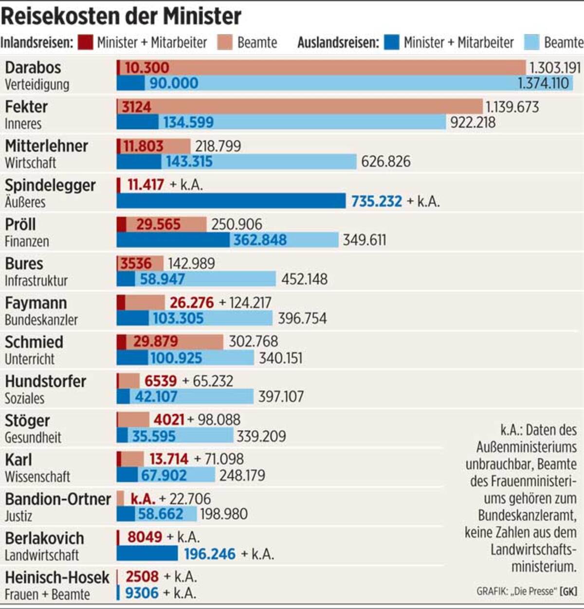 Möglicherweise wären sie in diesem Ranking vom Außenministerium überboten worden – wenn dieses brauchbare Zahlen abgeliefert hätte. Doch Minister Spindelegger gab nur an, wie viel eine Auslandsreise pro Beamten und Reisetag im Durchschnitt kostete – ohne die Anzahl der Reisetage zu verraten. Begründung aus dem Ministerium: Danach sei nicht eigens gefragt worden.