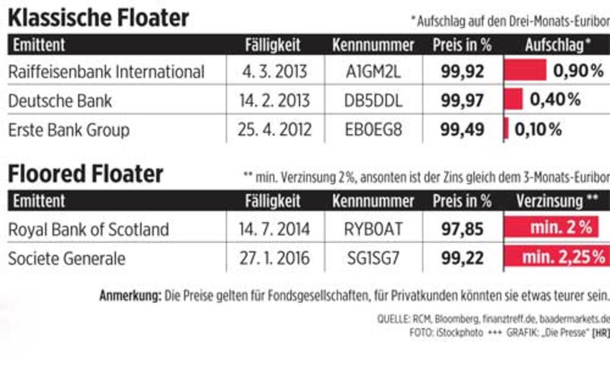 Die Raiffeisenbank International (RBI) zahlt für einen klassischen Floater einen Zinsaufschlag von 0,9 Prozent(siehe Tabelle unten, Anm.). Steht der Euribor im ersten Quartal 2012 tatsächlich bei zwei Prozent, macht der Zins für den Floater bereits 2,9 Prozent aus. Zum Vergleich: Die Erste Bank hat eine bessere Bonität, daher zahlt sie einen geringeren Aufschlag auf den Euribor.