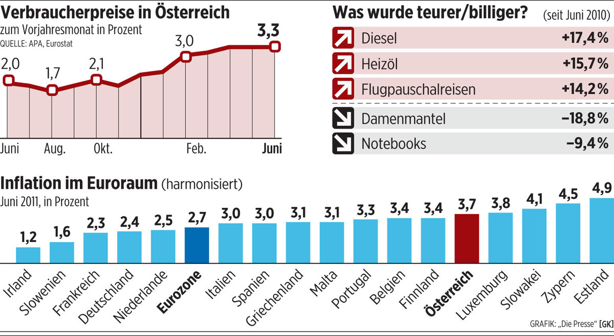 Auffallend ist, dass Österreich zu jenen Ländern innerhalb Europas gehört, in denen sich die Produkte am schnellsten verteuern. Schon seit Ende 2010 steigt die Inflationsrate hierzulande deutlich stärker an als in vielen anderen Staaten der EU. Im Juni betrug die Inflationsdifferenz zum Haupthandelspartner Deutschland etwa 1,3 Prozent.