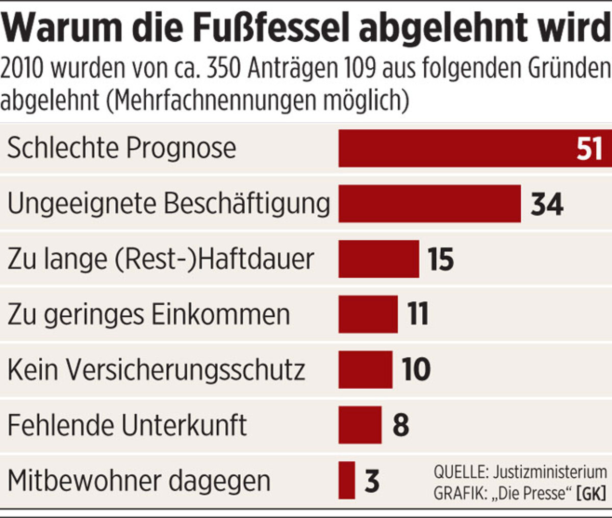 Statt 500 Häftlinge mit Fußfessel gibt es derzeit nur 188, bei denen zeigt das Projekt aber positive Wirkungen. Ersatz einer Haftstrafe durch Hausarrest mit Fußfessel ist unter gewissen Voraussetzungen möglich.