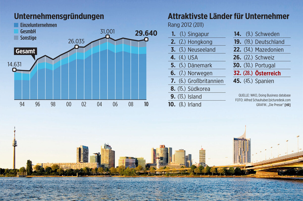 So reiht die Weltbank das Land in ihrem aktuellen Bericht „Doing Business 2012“, in dem sie die Rahmenbedingungen für Unternehmer weltweit vergleicht, nur auf den 32.Rang. Damit rutscht das Land im Vergleich zum Vorjahr gleich um vier Plätze ab. 13EU-Staaten, aber auch Länder wie Mazedonien, bieten Firmen bessere Bedingungen. An der Spitze dieser rein wirtschaftlichen Betrachtung liegt einmal mehr Singapur.