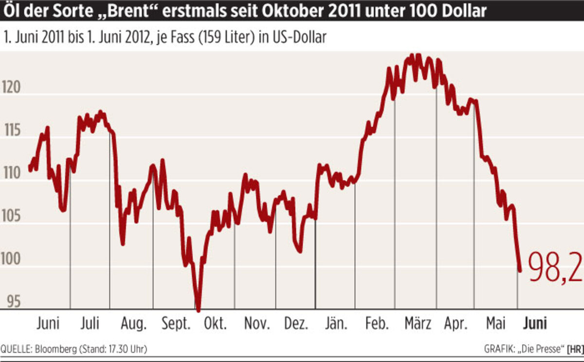 Wien/Ag./Nst. Erstmals seit acht Monaten ist Öl der Nordseesorte Brent unter die Marke von hundert Dollar gefallen. Der Preis gab am Freitag um etwa drei Prozent auf rund 99 Dollar je Barrel (159 Liter) nach. Zu Jahresbeginn kostete ein Fass noch 109 Dollar.