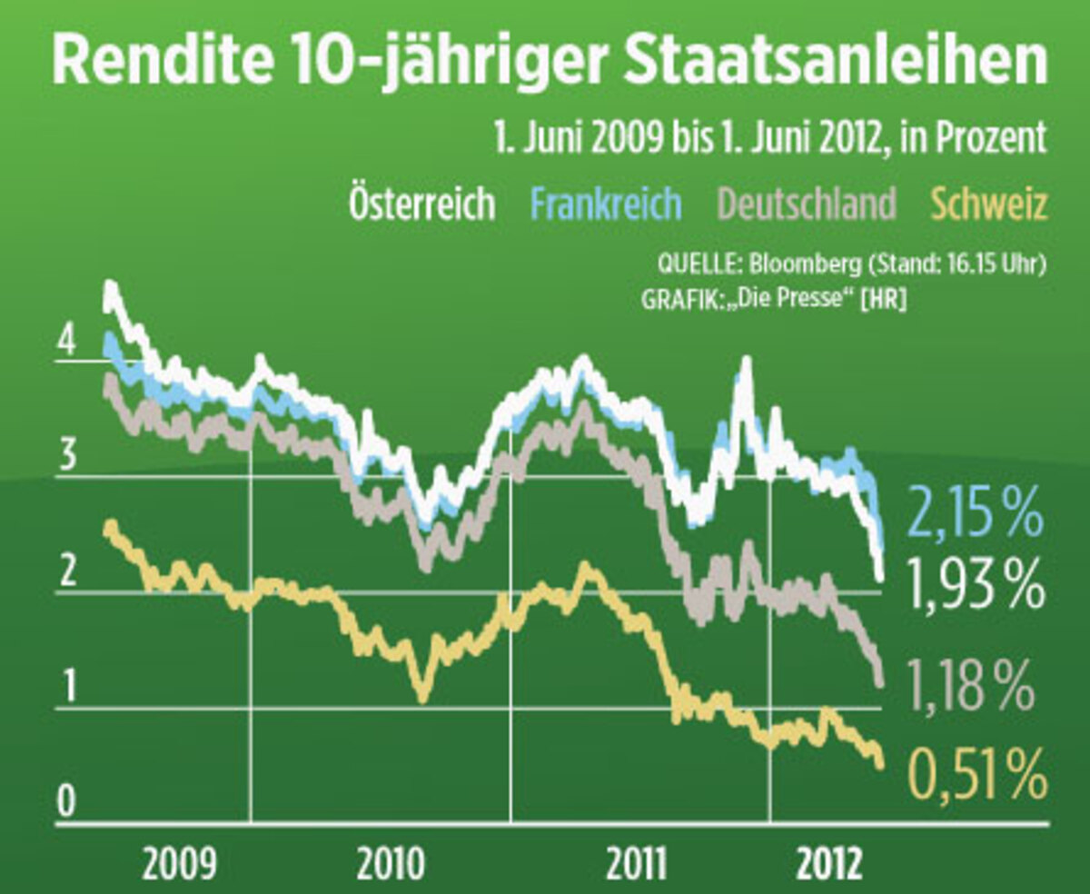 Risiko. Wer jetzt einsteigt, muss sich bewusst sein, dass die Rendite auch sehr schnell wieder steigen kann. Klettert sie bei deutschen Anleihen wieder auf 2,2Prozent, bedeutet das einen Kursverlust von zehn Prozent. Gleichzeitig kann es aber auch sein, dass die Kurse noch weiter klettern. Die Entwicklung der Eurokrise wird entscheiden, wie es kommt.